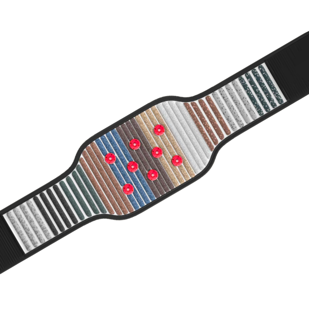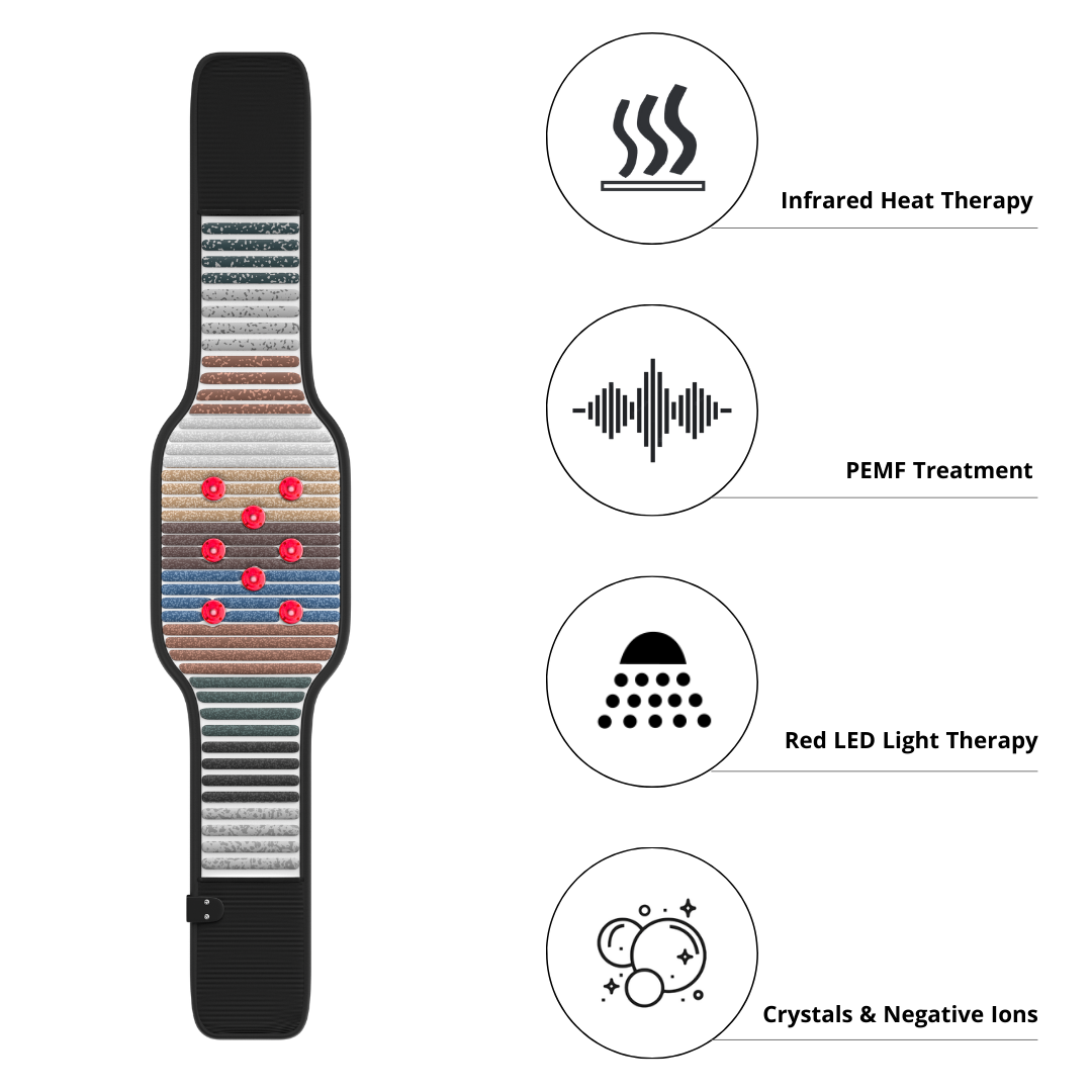 The infrared heat of the Body Belt is enhanced even further with consistent heat distribution through 44 individual pockets filled with Jade, Tourmaline, Clear Quartz, Amber, Amethyst Crystals, and Negative-Ion Producing Clay Beads.